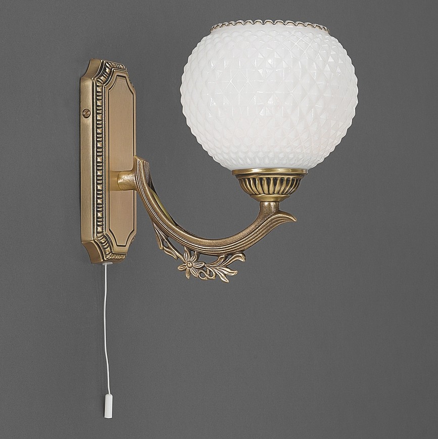 Бра Reccagni Angelo A 8650/1 Итальянского производсва – лучшее соотношение цена-качество. Этот светильник Классического стиля хорошо подойдет Для гостиной и придаст помещению мягкий и приятный свет. Плафоны белые из стекла. Арматура бронза из металла. Кол-во ламп - 1шт. Общая мощность 60W