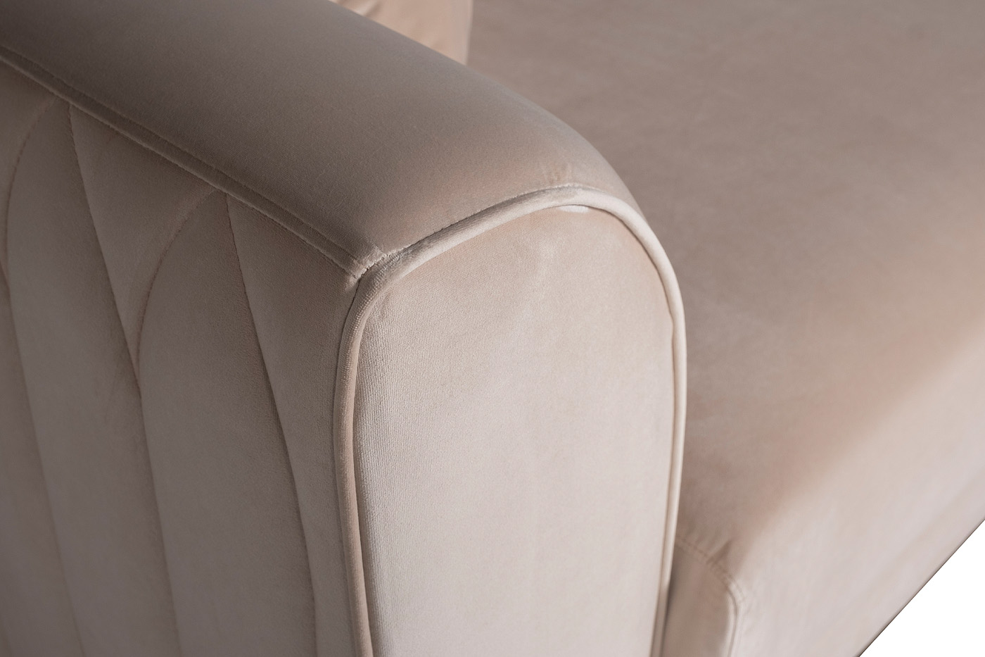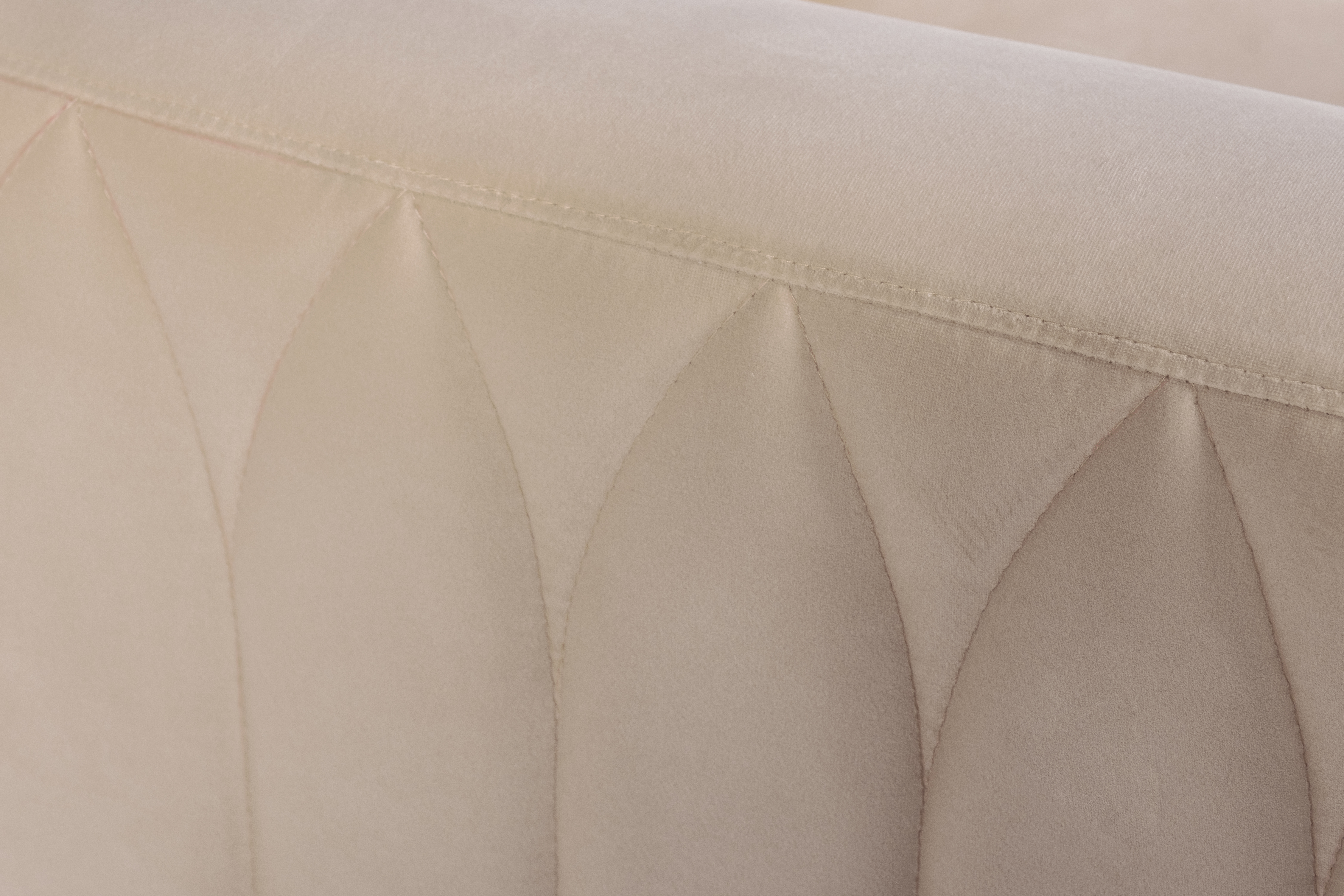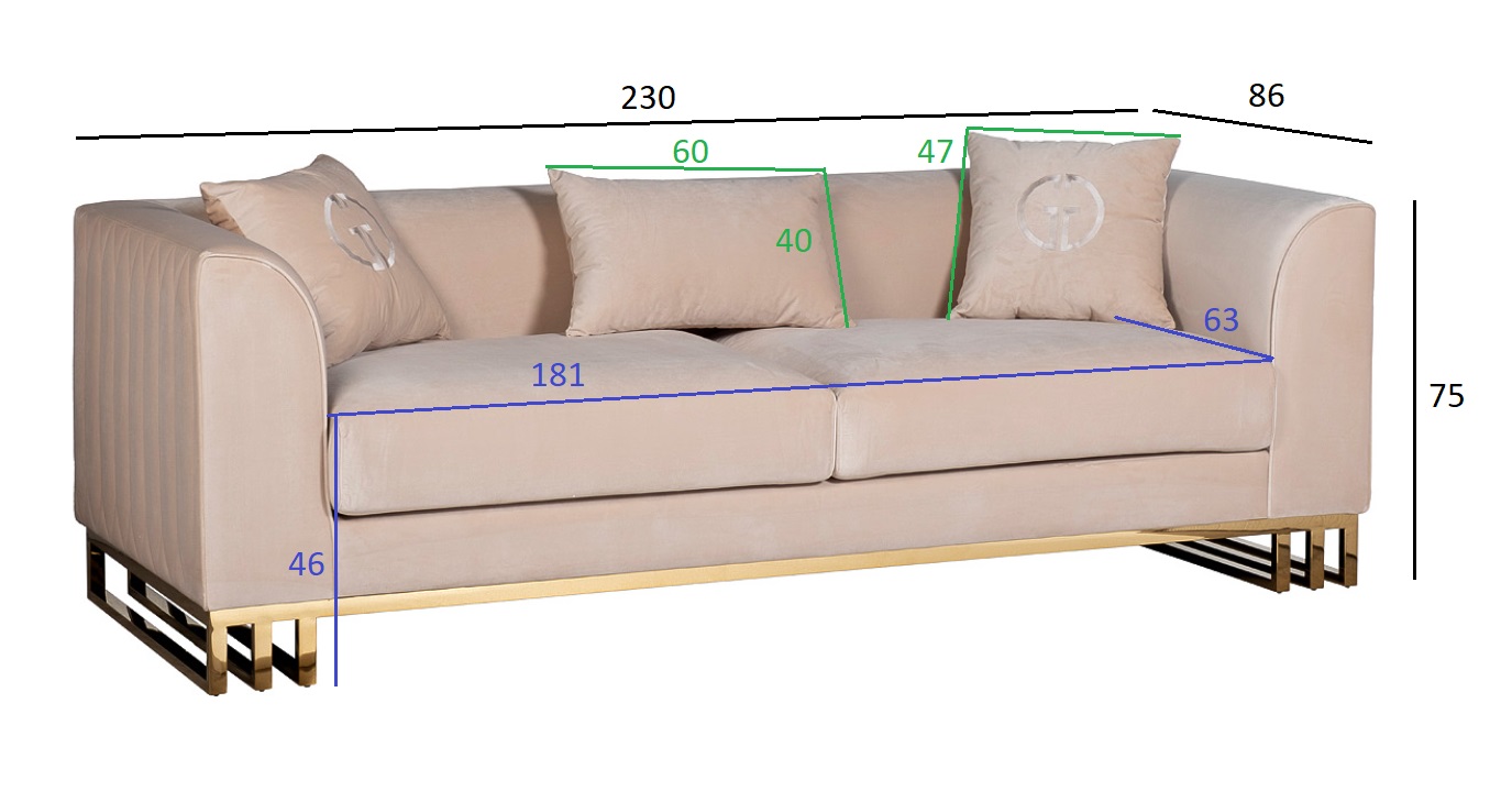 Диван Lucerne отличается силуэтом с прямыми углами, но при этом не выглядит громоздко за счет того, что нижняя часть приподнята на основании из металлического профиля. Внешняя часть декорирована прострочкой по приятному бежевому велюру, основание выполнено из нерж.стали с глянцевым золотым покрытием.