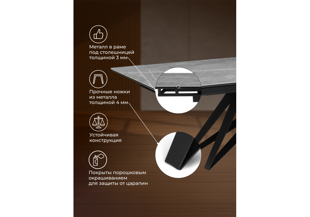Материал каркаса - металл; Материал столешницы - Керамика; Ширина - 80; Высота - 73; Длина стола в разложенном виде - 200; Длина - 140;