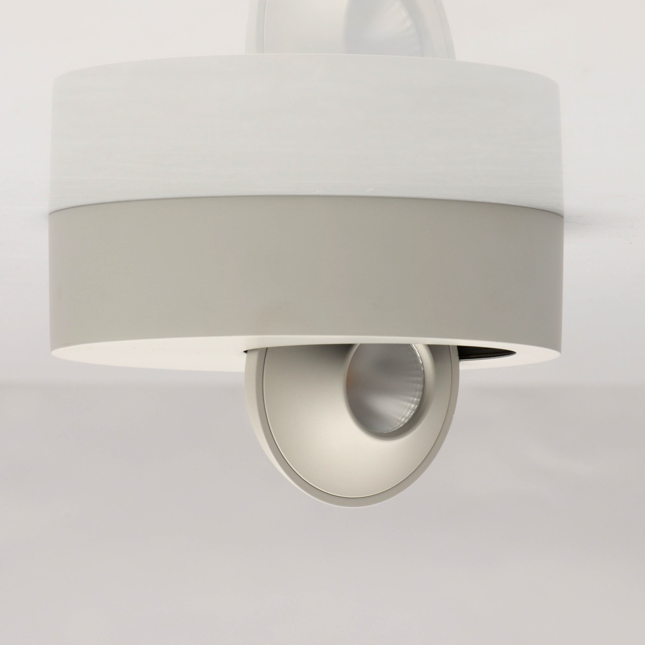 Основание выполнено из сплава алюминия и окрашено в серый цвет. Углубление для световых элементов окрашено в черный цвет. Светодиодные источники света типа COB закрыты белым матовым акрилом. Светильник снабжен инновационным поворотным механизмом.