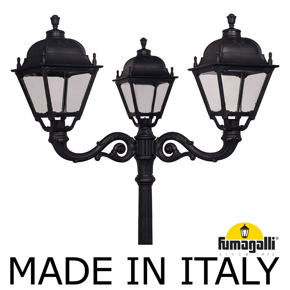 Парковый фонарь FUMAGALLI большого размера серии SIMON, модель TABOR ADAM/SIMON 3L. Парковый фонарь с 3 светильниками большого размера, на консолях ADAM большого размера, установленных на классическом столбе TABOR высотой 3,0 м (+высота фонарей на кронштейнах). Изготовлены в Италии, по уникальным технологиям "FUMATECH" из современного композитного полимера RESIN. Этот материал в 5 раз прочнее металла, не ржавеет, не окисляется, не выгорает на солнце, его не нужно красить. Все светильники пыле-влаго защищены по стандарту IP55 (Пылезащищенные, защита от водяных струй с любого направления). Рассеиватель выполнен из антивандального, не мутнеющего и не горючего PMMA (ПолиМетилМетаАкрилат). Срок службы светильника - не менее 20 лет. Температура использования от -60 до +90. В серии SIMON есть садовые фонари в настенном (OFIR/SIMON, MIRRA/SIMON) подвесном (SICHEM/SIMON) и наземном исполнении (IAFAET.R/SIMON, ALOE.R/SIMON, ARTU/SIMON, GIGI/SIMON, RICU/SIMON, NEBO/OFIR/SIMON 1L, NEBO/OFIR/SIMON 2L, TABOR/ADAM/SIMON 3L) со столбами разной высоты, с разным количеством и конфигурацией голов. Консоли настенных фонарей и кронштейны светильников на столбах освещения могут устанавливаться в положение вверх и вниз. Столбы выше 150 см имеют в основе мощную стальную трубу с двойной оцинковкой. При заказе требуется выбрать цвет корпуса, цвет плафона и тип патрона (Е-27 или LED GX-53). Возможен светодиодный вариант. По стилю и дизайну серия уличных светильников SIMON похожа на светильники среднего размера серии CEFA. По размеру относится к большим парковым светильникам как серия NOEMI и GLOBE 400.