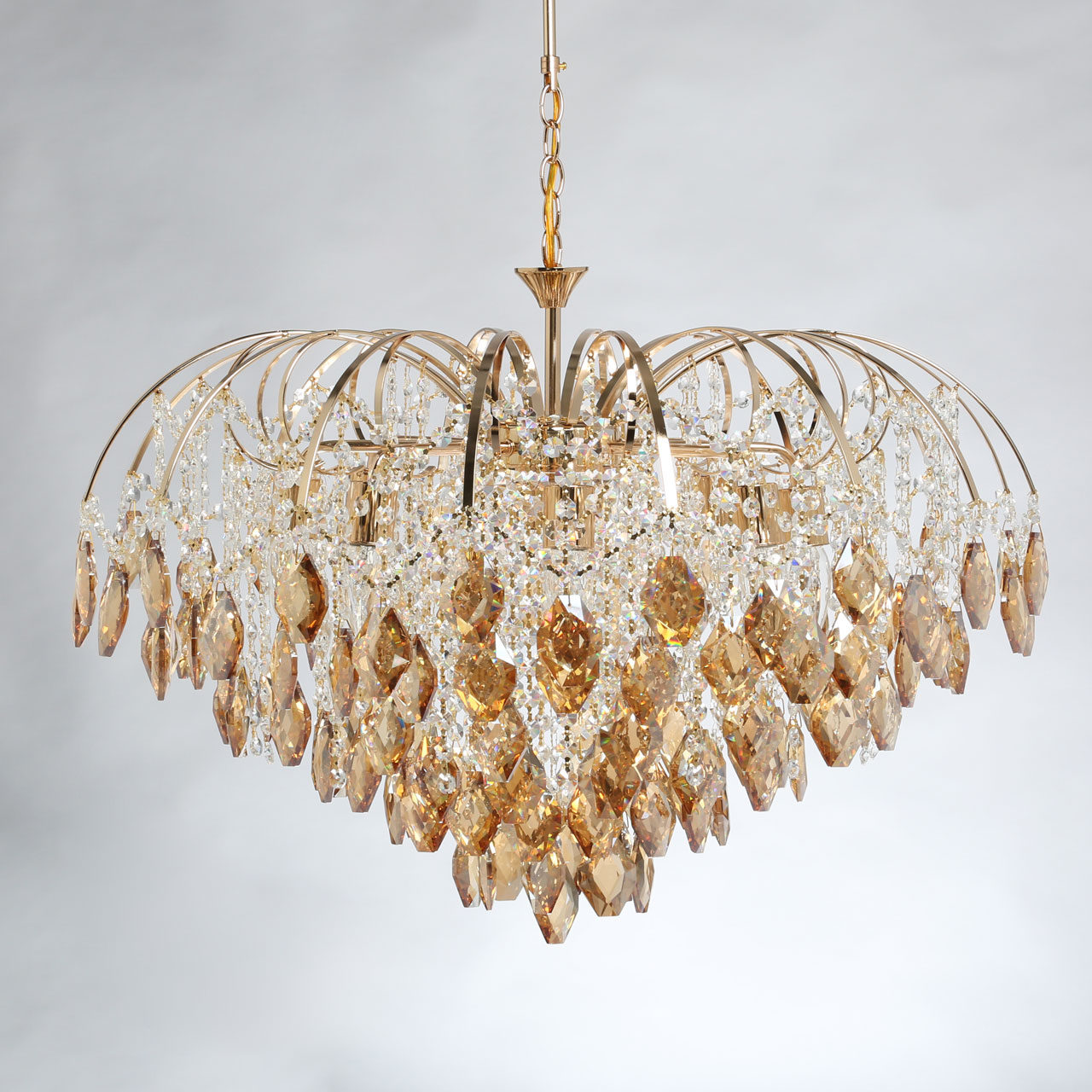 Хрустальный массивный декор янтарного цвета.Подвески из хрусталя и цепочки из прозрачных октагонов создают красивую игру света.Классический золотой цвет основания всегда в тренде.Большой диаметр модели обеспечивает высокие параметры освещенности.Регулируемая высота светильника за счет звеньев цепи.