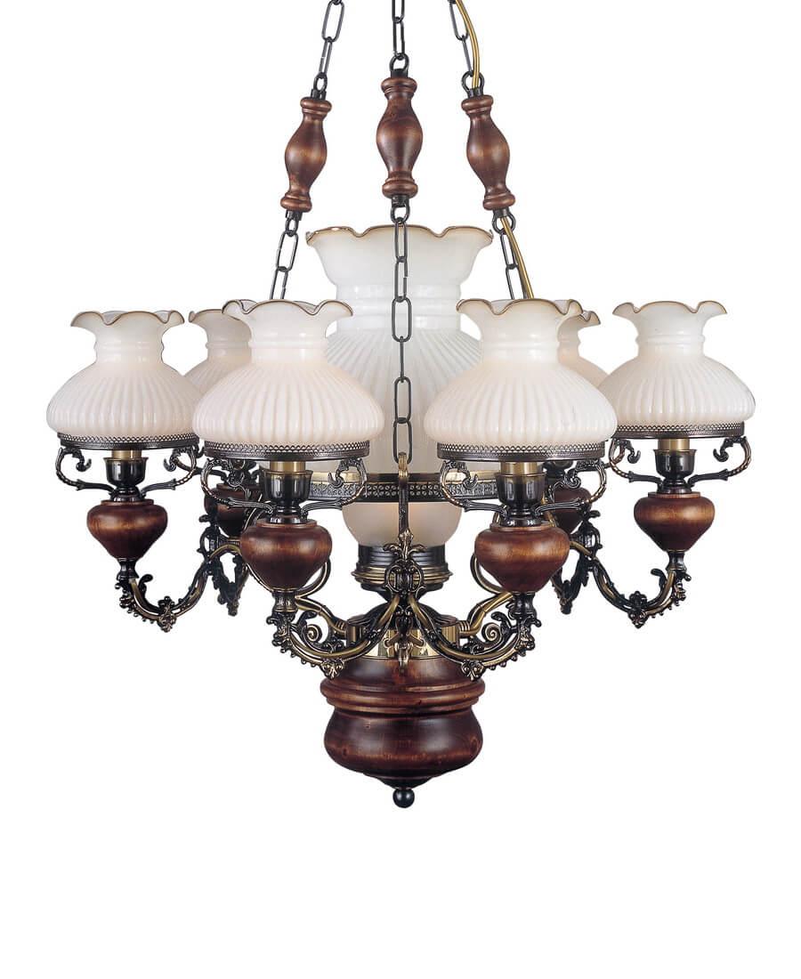 Подвесная люстра Reccagni Angelo L 634/6+1 Итальянского производсва – уникальное сочетание высокого качества и удивительных фактур. Этот светильник Классического стиля хорошо подойдет Для гостиной и придаст помещению мягкий и приятный свет. Плафоны белые из стекла. Арматура бронза из металла. Кол-во ламп - 7шт. Общая мощность 420W