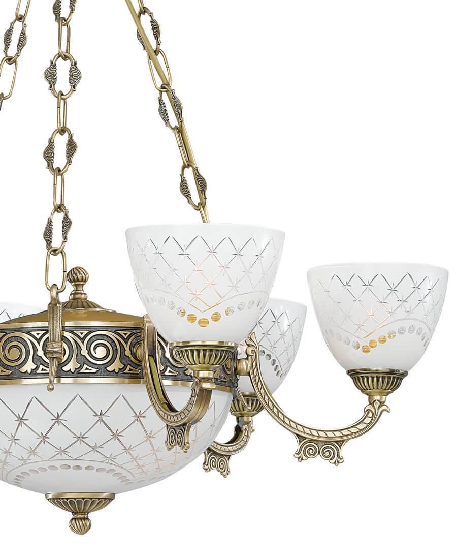 Подвесная люстра Reccagni Angelo L 7052/6+2 Итальянского производсва – уникальное сочетание высокого качества и удивительных фактур. Этот светильник Классического стиля хорошо подойдет Для гостиной и придаст помещению мягкий и приятный свет. Плафоны белые из стекла. Арматура бронза из металла. Кол-во ламп - 8шт. Общая мощность 480W