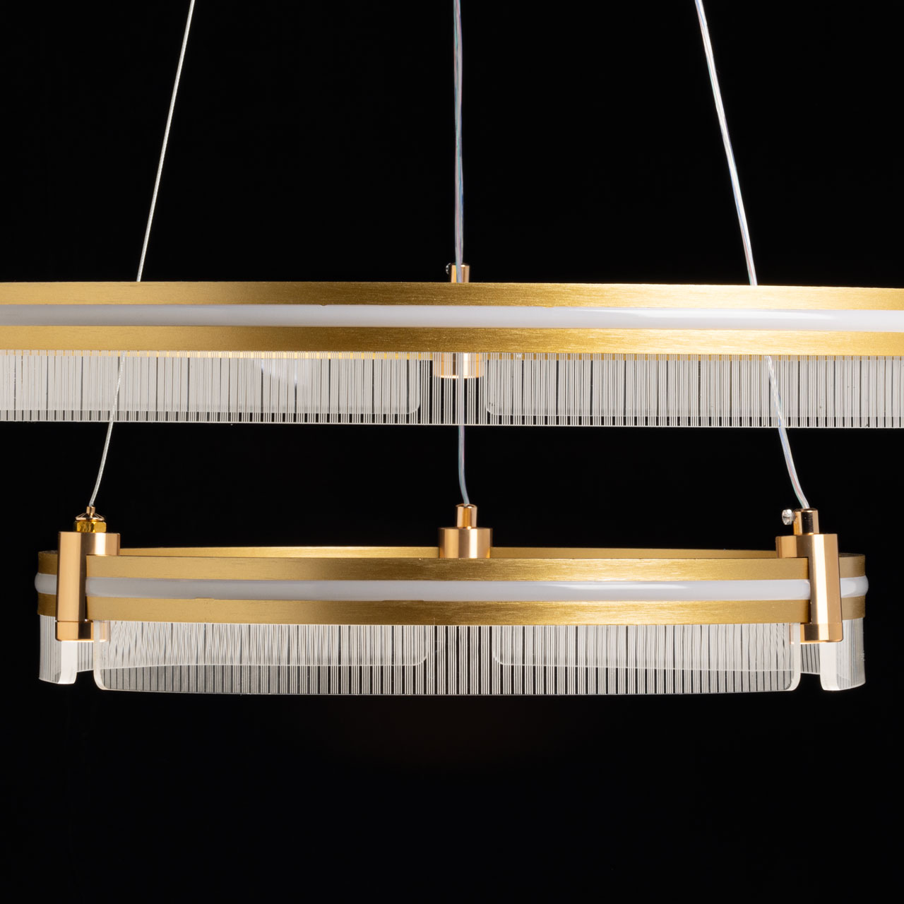 Металлическое основание светильника гальванизировано в цвет золота. Корпус плафона выполнен из сплава алюминия с цинком и обработан по технологии порошкового окрашивания в цвет матового золота. Светодиодные источники света закрыты белым силиконом. Люстра декорирована пластинами из прозрачного акрила с линейным рисунком.