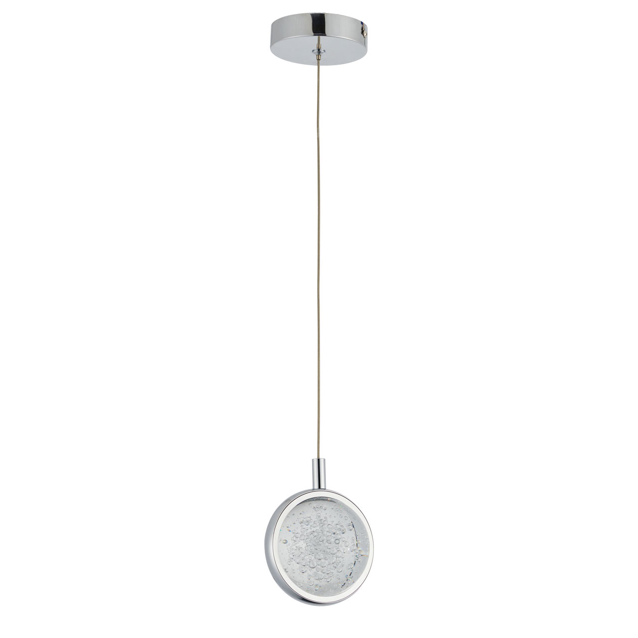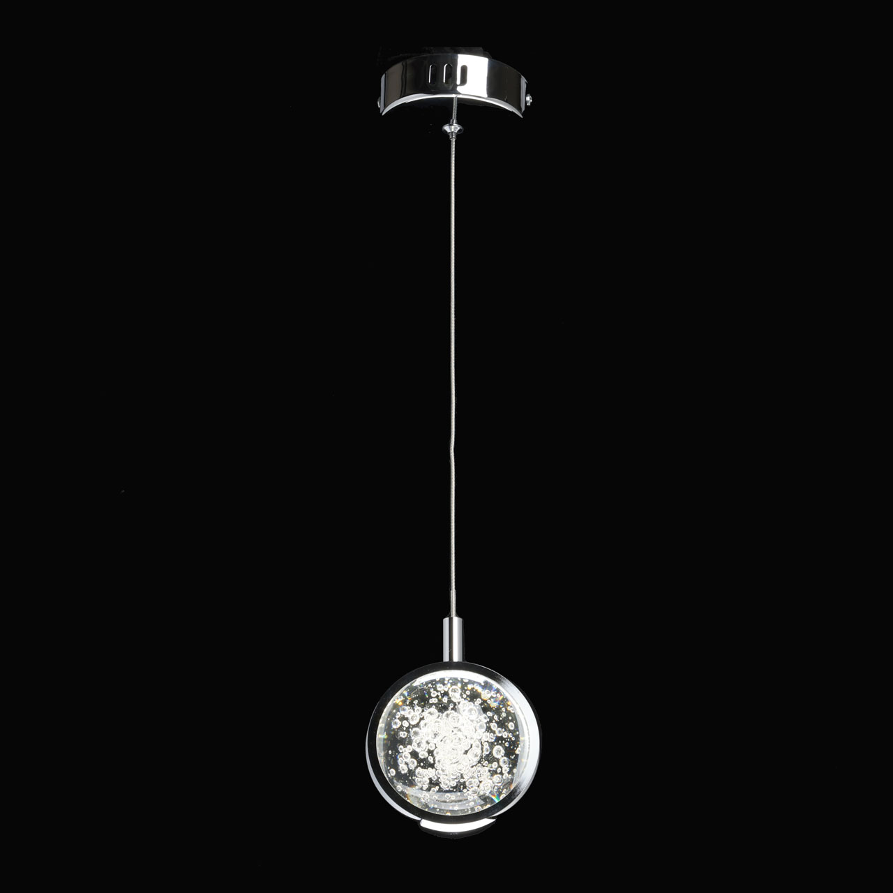 Основание светильника выполнено из сплава алюминия с цинком, обработано по технологии брашинга и гальванизировано в цвет хрома. Светодиодный источник света закрыт сферой из стекла с включениями пузырьков.