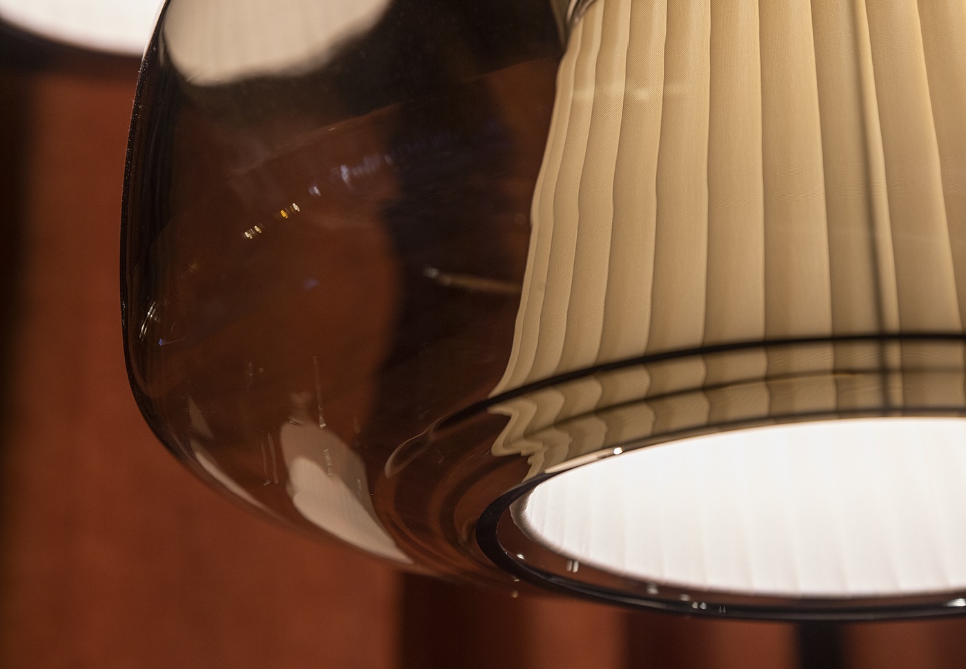 Подвесной светильник Vistosi Plisse SP G Amber с арматурой матового бронзового цвета. Выдувное стекло диффузора янтарного цвета скрывает внутренний тканевый абажур и дает жизнь игре прозрачности, цветов и текстур, которые делают Plissè элегантным элементом, способным охарактеризовать и придать индивидуальность помещению, в котором он находится.