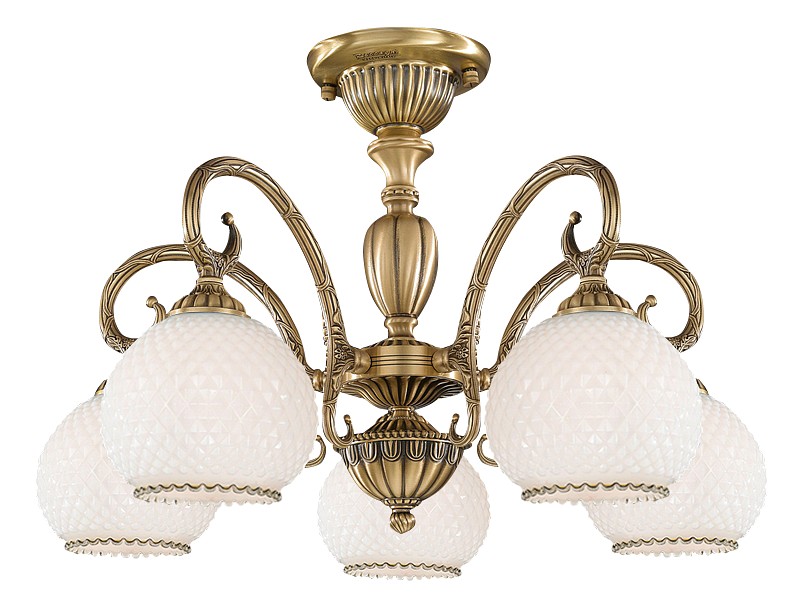 Потолочная люстра Reccagni Angelo PL 8420/5 Итальянского производсва – отличный выбор для Вас. Этот светильник Классического стиля хорошо подойдет Для спальни и придаст помещению мягкий и приятный свет. Плафоны белые из стекла. Арматура бронза из металла. Кол-во ламп - 5шт. Общая мощность 300W
