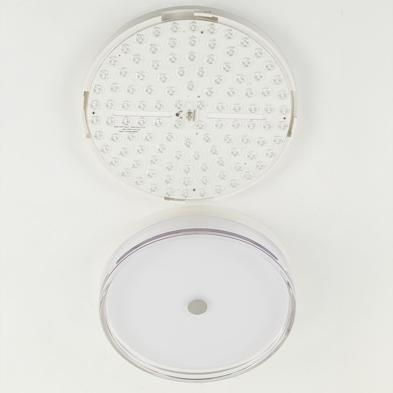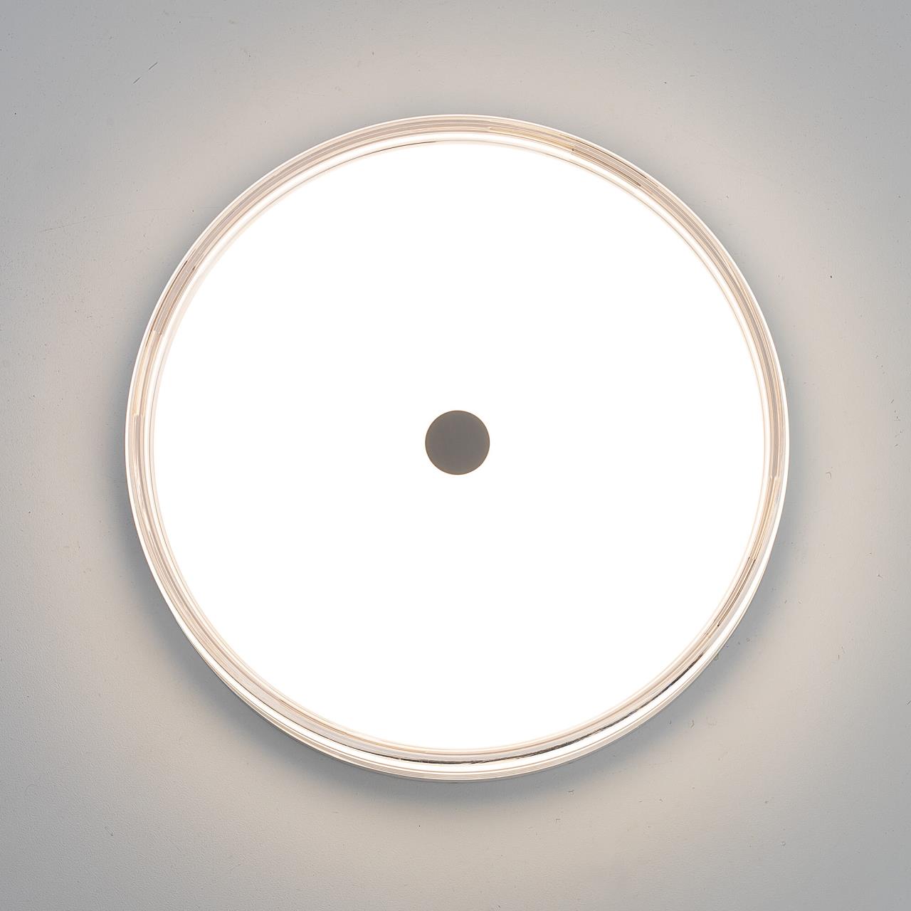 Корпус светильника изготовлен из высокопрочного полимера, рассеиватель — из оптического полимера, причем внешняя часть — прозрачная с глянцевой поверхностью, а внутри добавлена матовая вставка. Общий диаметр светильника — 40см. Источником света служат встроенные светодиоды, при установке вы можете выбрать температуру свечения (теплый, нейтральный или белый свет). Но в любом случае, свет не будет резать глаза и утомлять зрение, заливая пространство мягким потоком без мерцания и пульсаций.