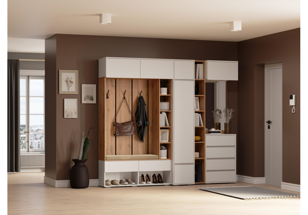 Состав комплекта; готовая прихожая -593741 , стеллаж -593722 , готовая прихожая -593740 , навесной шкаф -593743 , навесной шкаф -593744 , шкаф -593739 .