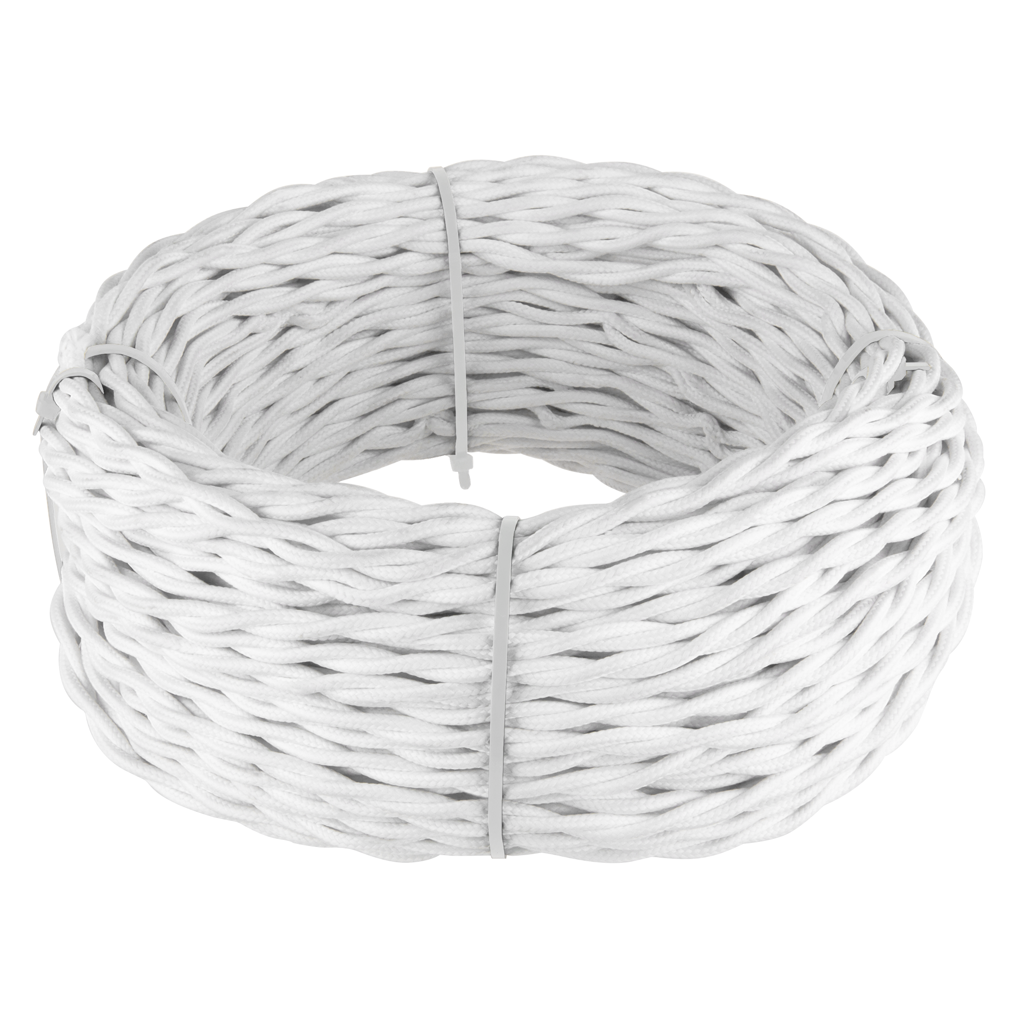 Ретро кабель витой 2х2,5 белый 20 м. Многожильный медный провод обеспечивает гибкость кабеля и его высокие электротехнические характеристики. Наружная оплетка кабеля имитирует натуральный шелк. Декоративно - защитная оплетка из полиэфирной нити придает кабелю эстетичный внешний вид, выгодно отличаясь высокой прочностью и гигиеничностью. Неоспоримым преимуществом в плане качества является то, что нити оплетки провода имеют специальную пропитку, которая делает их негорючими, поэтому такая ретро проводка подходит для того, чтобы размещать ее открытым способом.