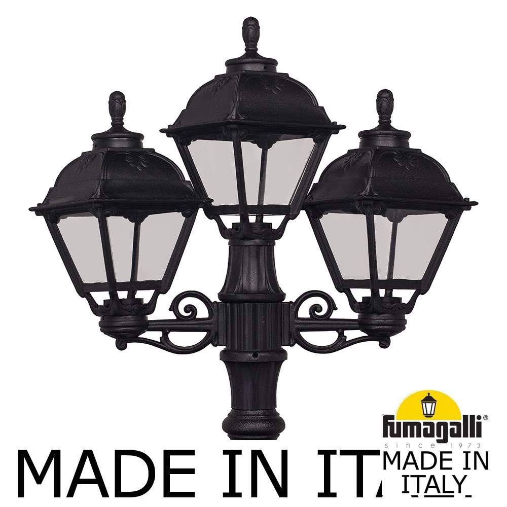 Садово-парковый фонарь FUMAGALLI серии CEFA, модель CEFA /ARTU/BISSO 2+1. Парковый торшер, столб ARTU с двумя уличными фонарями CEFA на двух малых консолях BISSO и одним светильником на опоре, по центру. Используются для архитектурного и ландшафтного освещения в стиле "классика". Место установки столбиков освещения - парковые дорожки, cкверы, садовые участки, тротуары, а так же ландшафтные и архитектурные объекты. Могут устанавливаться и внутри помещений в качестве декоративных уличных фонарей. Изготовлены в Италии, по уникальным технологиям "FUMAGALLI" из современного композитного полимера RESIN. Этот материал в 5 раз прочнее металла, не ржавеет, не окисляется, не выгорает на солнце, его не нужно красить. Все светильники пыле-влаго защищены по стандарту IP55 (Пылезащищенные, защита от водяных струй с любого направления). В комплекте идут крепежи и закладные элементы. Рассеиватель выполнен из антивандального, не мутнеющего и не горючего PMMA (ПолиМетилМетаАкрилат). Срок службы светильника - не менее 20 лет. Температура использования от -60 до +90. В серии CEFA есть фонари в настенном (BISSO/CEFA, OFIR/CEFA, MIRRA/CEFA, PORPORA/CEFA) подвесном (SICHEM/CEFA) и наземном исполнении (MINILOT/CEFA, MIZAR.R/CEFA, IAFAET.R/CEFA, ALOE.R/CEFA, ARTU/CEFA, GIGI/CEFA, RICU/CEFA, RICU/ISSO/CEFA 2L, NEBO/CEFA, NEBO OFIR/CEFA 2L, NEBO OFIR/CEFA 3L) со столбами разной высоты, с разным количеством и конфигурацией голов. Консоли настенных фонарей и кронштейны светильников на столбах освщения могут устанавливаться вверх/вниз. Столбы выше 150 см имеют в основе мощную стальную трубу с двойной оцинковкой. При заказе требуется выбрать цвет корпуса, цвет плафона и тип патрона. По стилю и дизайну серия уличных светильников CEFA похожа на светильники большого размера SIMON и на светильники очень большого размера (Гранд) PIETRO. По размеру CEFA относится к средним светильникам как серия RUT, SALEM и GLOBE 300.