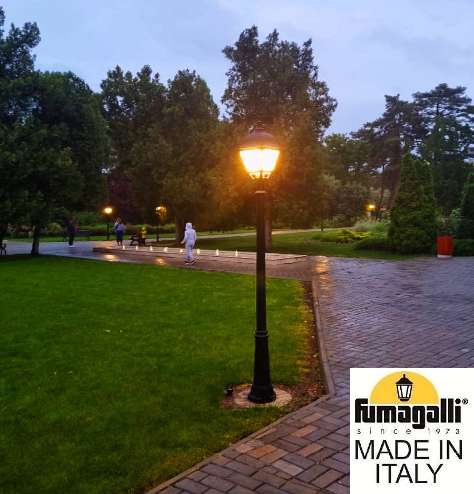 Садово-парковый фонарь FUMAGALLI среднего размера серии SIMON, модель RICU/SIMON. Парковый фонарь с 1 венчающим светильником большого размера в на классическом столбе RICU высотой 2,0 м (+высота фонаря). Предназначен для освещения парковых дорожек, cкверов, садовых и ландшафтных композиций, и других общественных пространств. Используется в качестве основного уличного освещения на городских улицах и площадях. Изготовлены в Италии, по уникальным технологиям "FUMATECH" из современного композитного полимера RESIN. Этот материал в 5 раз прочнее металла, не ржавеет, не окисляется, не выгорает на солнце, его не нужно красить. Все светильники пыле-влаго защищены по стандарту IP55 (Пылезащищенные, защита от водяных струй с любого направления). Рассеиватель выполнен из антивандального, не мутнеющего и не горючего PMMA (ПолиМетилМетаАкрилат). Срок службы светильника - не менее 20 лет. Температура использования от -60 до +90. В серии SIMON есть садовые фонари в настенном (OFIR/SIMON, MIRRA/SIMON) подвесном (SICHEM/SIMON) и наземном исполнении (IAFAET.R/SIMON, ALOE.R/SIMON, ARTU/SIMON, GIGI/SIMON, RICU/SIMON, NEBO/OFIR/SIMON 1L, NEBO/OFIR/SIMON 2L, TABOR/ADAM/SIMON 3L) со столбами разной высоты, с разным количеством и конфигурацией голов. Консоли настенных фонарей и кронштейны светильников на столбах освещения могут устанавливаться в положение вверх и вниз. Столбы выше 150 см имеют в основе мощную стальную трубу с двойной оцинковкой. При заказе требуется выбрать цвет корпуса, цвет плафона и тип патрона (Е-27 или LED GX-53). Возможен светодиодный вариант. По стилю и дизайну серия уличных светильников SIMON похожа на светильники среднего размера серии CEFA. По размеру относится к большим парковым светильникам как серия NOEMI и GLOBE 400.
