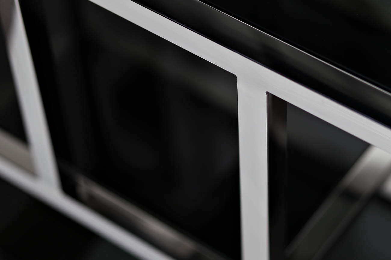 Самые модные тенденции европейского интерьерного дизайна воплотились в роскошном стеллаже серебристой стали с полками из закаленного черного стекла. Статуэтки, книги и вазы, размещенные на полках в произвольном порядке, сразу превращают стеллаж в изысканный арт-объект. Дополните интерьер зеркалами и нетривиальным освещением, и ваша комната будет выглядеть как с обложки дизайнерского журнала.