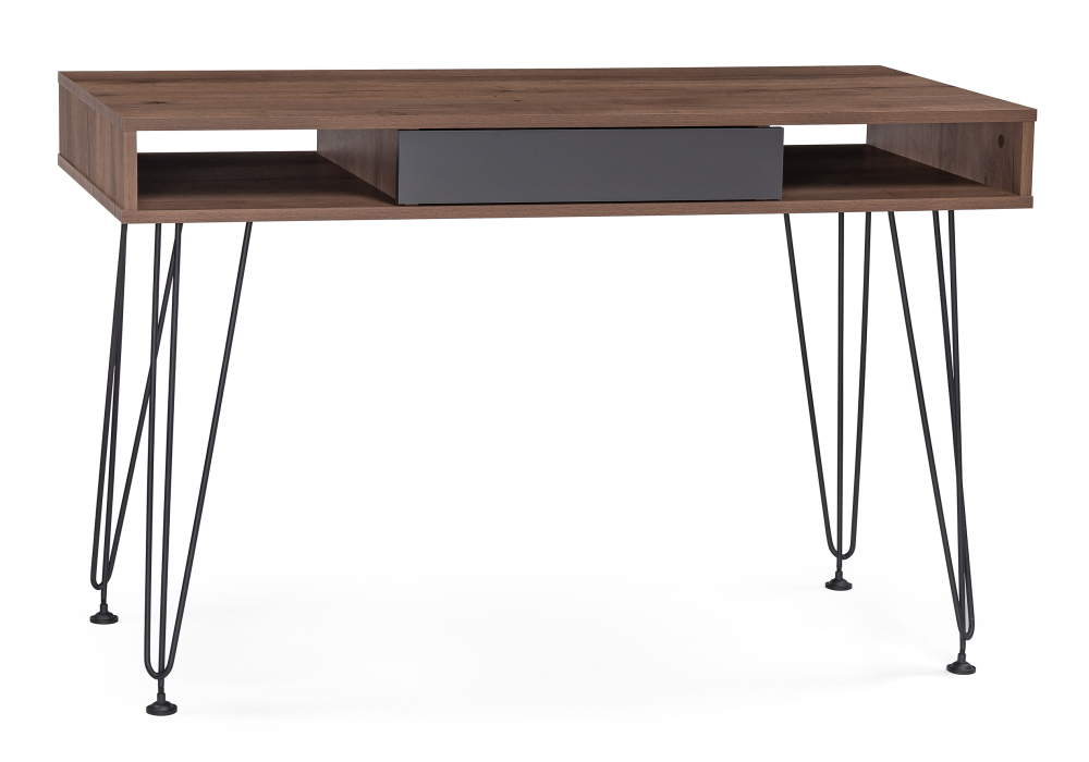 Толщина столешницы: 1,6 см. Материал каркаса - Металл; Материал ножек - Металл; Материал столешницы - ЛДСП; Материал подстолья - ЛДСП; Цвет каркаса - Черный; Цвет ножек - Черный; Цвет столешницы - Дуб табачный / графит; Ширина - 60; Высота - 77; Длина - 120;