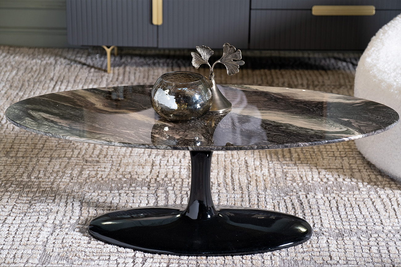 Стильный журнальный стол под мрамор способен внести нотки роскоши в любое жилое пространство. С ним интерьер гостиной приобретает элегантную аристократичность и становится более функциональным. Овальный журнальный стол универсален в плане компоновки с другой мебелью – он гармонично смотрится в стилистике ар-деко, классика, авангард, фьюжн, ар-нуво. Столешница c мраморным принтом придает ему особенное изящество, выглядит дорого и благородно благодаря имитации узора природного камня. На сайте Garda Decor вы можете купить этот журнальный черный стол, а также другие элементы декора и мебель в аналогичном стиле.