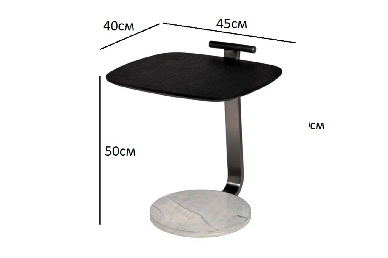 Лаконичный приставной журнальный столик – стильный и функциональный элемент современного интерьера. Его сбалансированный дизайн сочетает в себе натуральные материалы и смелые линии: массивная база из природного светлого мрамора обеспечивает устойчивость, а легкая изогнутая металлическая опора с покрытием серого цвета придает конструкции динамику. Столешница из МДФ со шпоном цвета венге подчеркивает природную эстетику модели. Компактный журнальный столик легко перемещается и гармонично вписывается в пространство, будь то уютная гостиная или стильный рабочий уголок. Толщина столешницы: 25мм