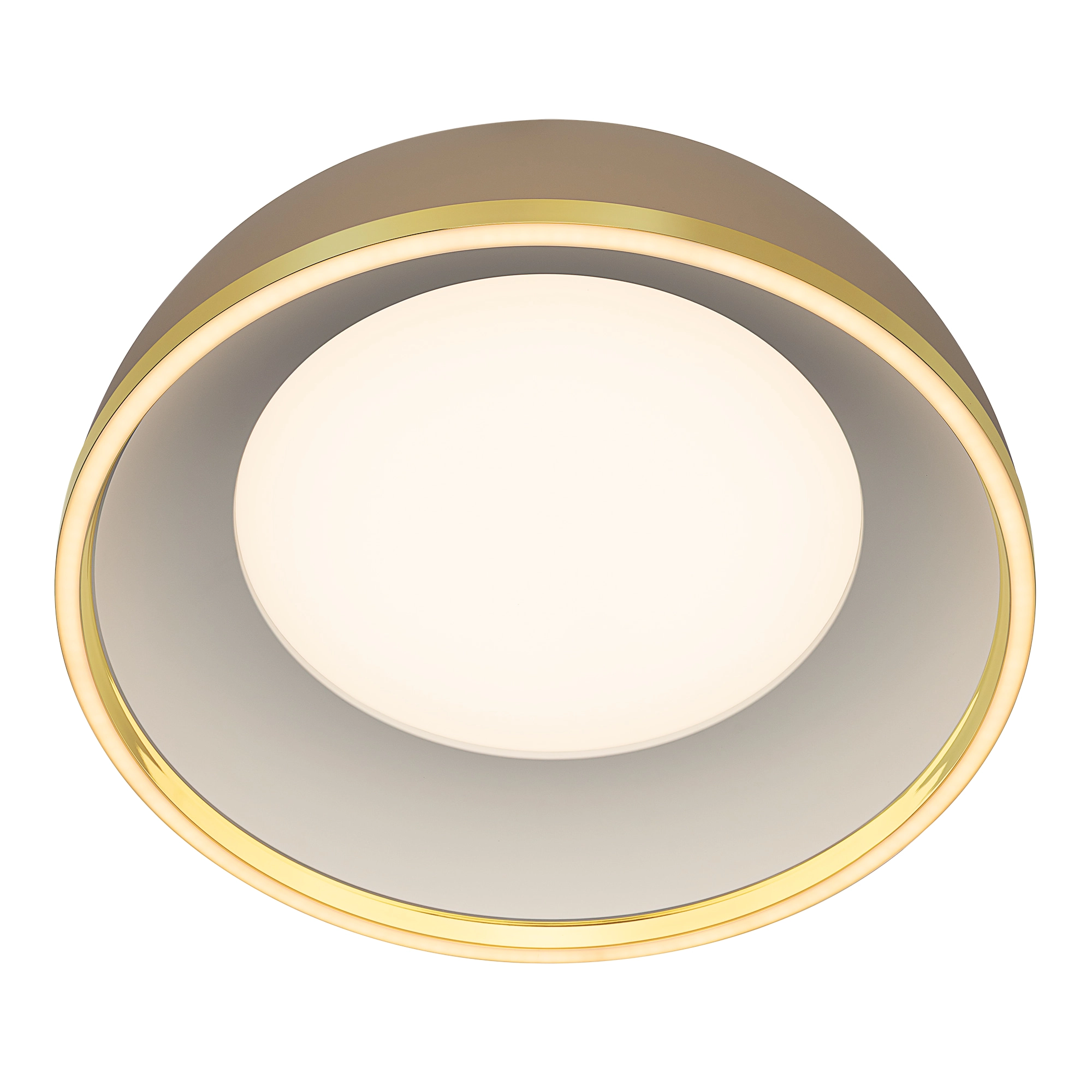 Корпус светильника из металлического сплава, модного бежевого оттенка, дополненный стильной золотой окантовкой по краю плафона. Рассеивателем служит оптический полимер.
