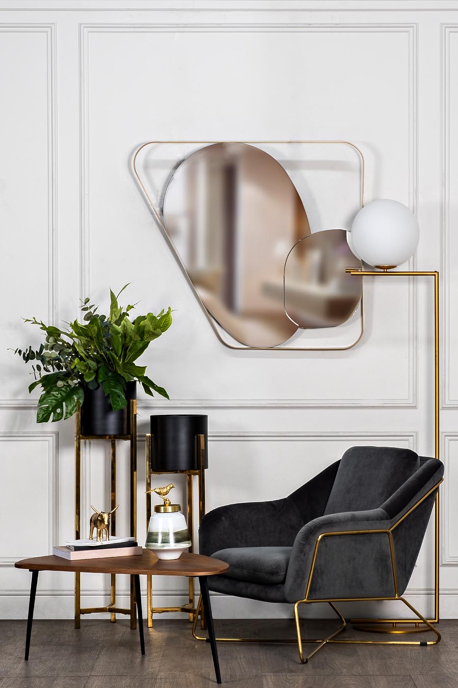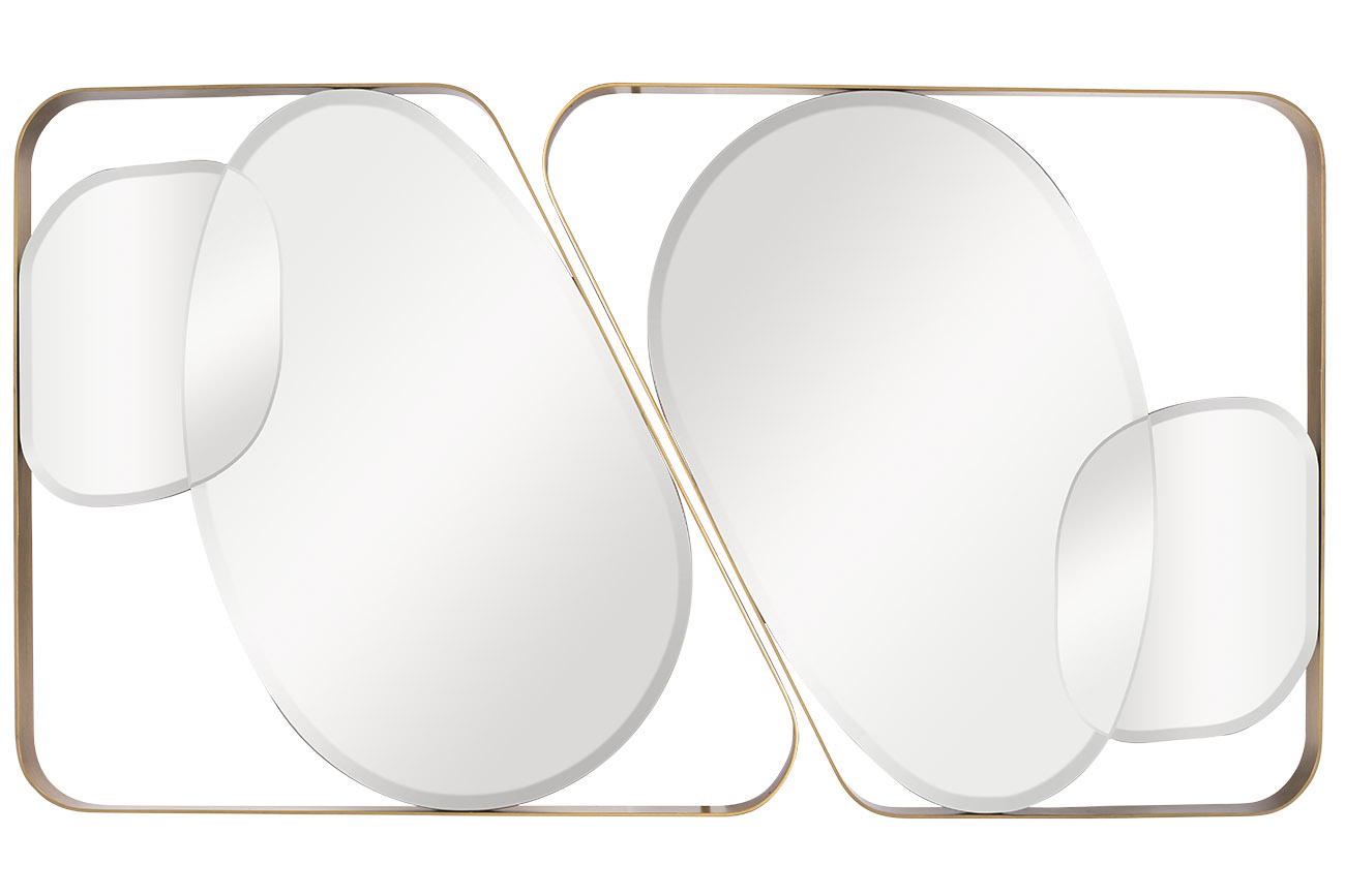 Дизайнерское ассиметричное зеркало в золотой оправе украсит интерьер в современном стиле или стиле ар-деко. Два зеркала, развернутые на 180 градусов по отношению друг к другу, составят необычное и изысканное панно.